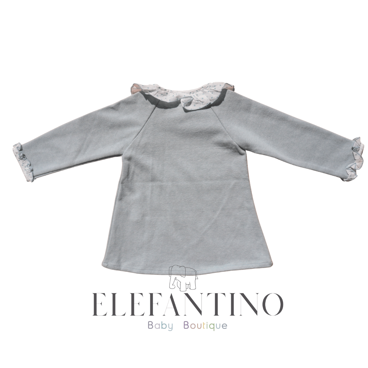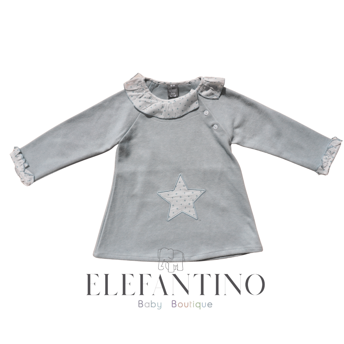 Vestido bebé azul de manga larga con volante blanco y detalles de estrellas, tu nena siempre lucirá elegante con este diseño de la temporada Otoño-Invierno.