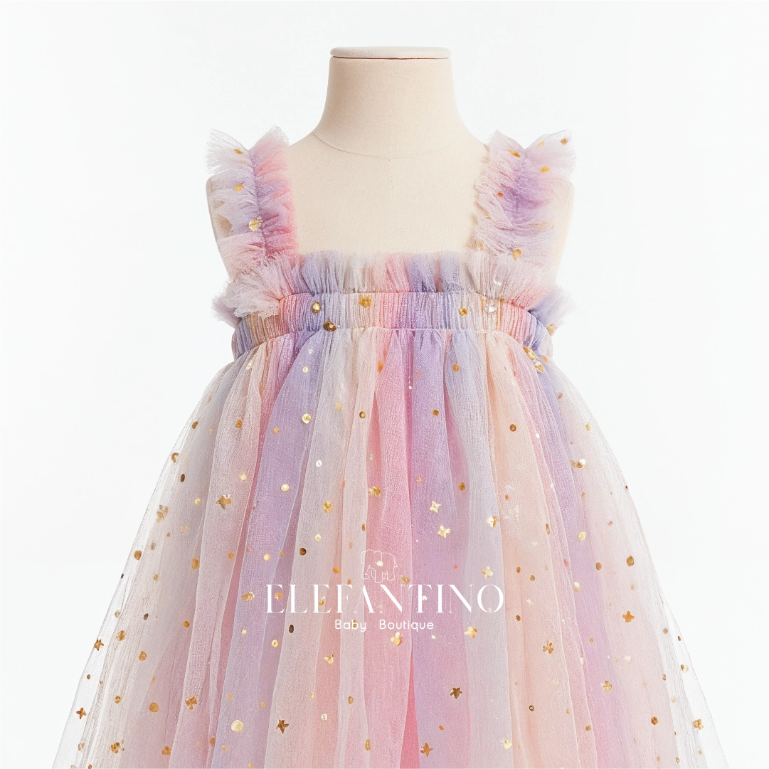 Este vestido es ideal para ocasiones especiales . Con un diseño de estrellas y detalles delicados en los hombros, aporta un estilo moderno que no pasa desapercibido.