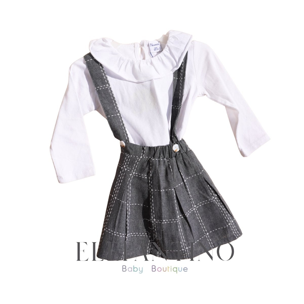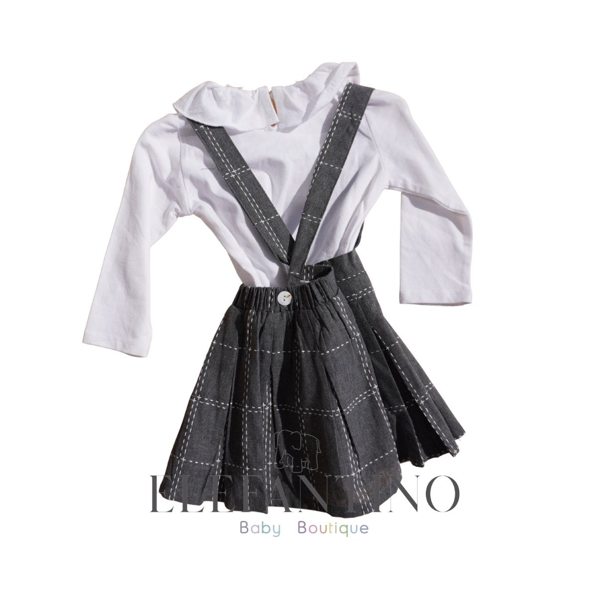 Conjunto incluye camisa de manga larga blanca  y overol gris con cuadros creando una combinación.