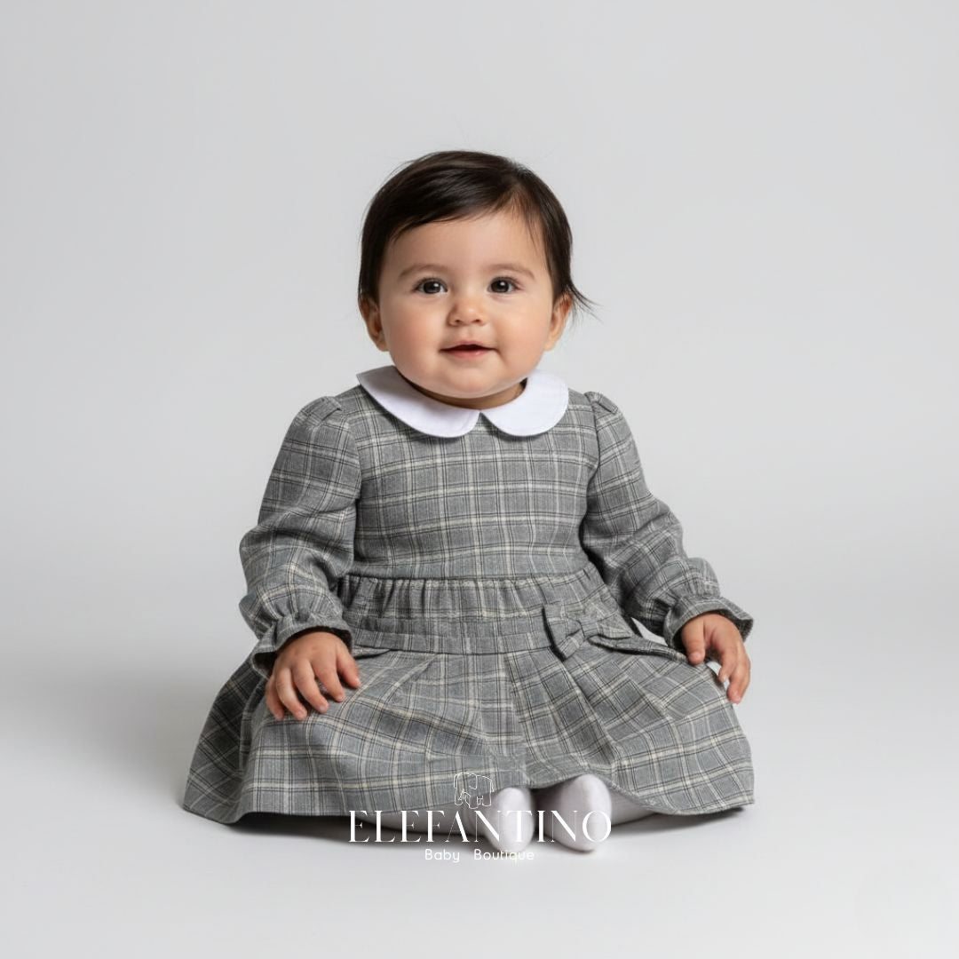 Vestido gris a cuadros para bebé niña confeccionado en tela suave y estructurada, ideal para brindar comodidad y libertad de movimiento. Diseño de manga larga con ligero fruncido en puños, corte amplio y delicado cuello blanco tipo Peter Pan que aporta un estilo clásico y elegante.